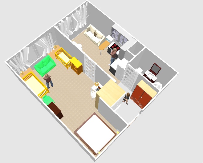 А теперь у нас остается большое пространство -3,0х3,7 метра, где мы располагаем гостинную и зону отдыха и зону игр для малышей, в дальнейшем эта зона обрастет более значимимы вещами - такими как столы для учебы, стелажи. А пока я бы поставила диванчик , деткий столик, под окна икеевский низкий стелаж для хранения игрушек. Дверь???!! ЕЕ в этой зоне можно расположить сразу после тумбочи прикроватной, но тут нужно думать про кухню, про нее не думала.