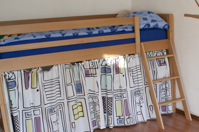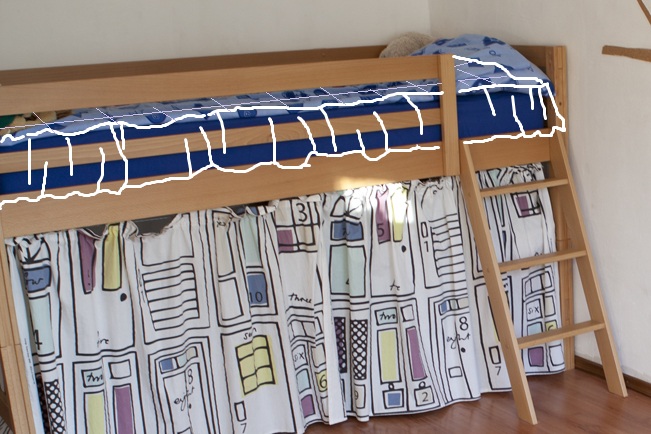 или только приспущенное покрывальце без рюш) заодно и фиксировать его в том месте где лестница (как на картинке), чтобы не "гуляло" когда малыш просто днем там будет лазить)