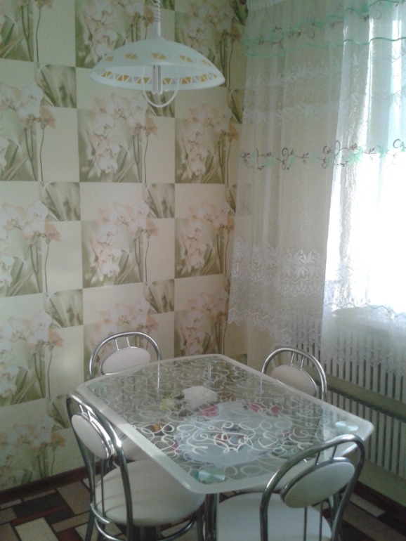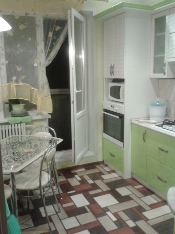 Тюль есть салатовая, на втором фото ))) Пол такой, потому что двери во всей квартире такого темного цвета. Стол стеклянный, с нежно-молочным узором. Нам удобно.