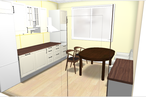 Теперь думаю как лучше. Кухня будет Икеа, Лидинго скорее всего. Накидала 2 варианта: кухня около окна и кухня там, где она должна быть по плану-вдоль стены.