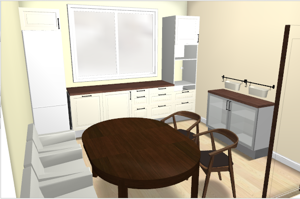 Само расположение шкафов накидала примерно, это нужно поиграть еще в программе. Основное определится: вдоль какой стены ставить кухню????