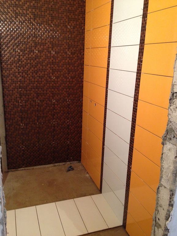 Итоговые фото будут где-то через 1,5-2 недели. Белая и оранжевая плитка в мелкую еле заметную горизонтальную полоску.
