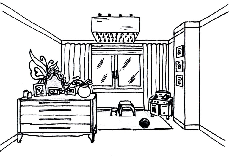 Люстру я сначала заштриховала и думала, что будет красивым ее сделать черной, но потом решила сделать ее светлой и повесить такую же над детской зоной.В детской зоне я предлагаю кровать с высоким изголовьем, рядом тумбочка, к изголовью кровати и тумбочке приставлен комод. Таким образом гости смотрят на комод и красиво торчащее за ним изголовье, а у ребенка свой отгороженный угол, при этом много воздуха и света (без громостких стеллажей). Больше я ничего не рисовала, потому что остальная зона игровая и у каждого ребенка найдется, что туда поставить. Вот для примера нарисовала детский столик, стульчик и игрушечную кухню. Вы можете добавить стеллажи, сундуки, открывающиеся пуфы и хранить там игрушки. )))