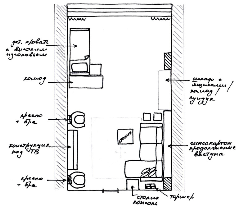 У двери зона для взрослых Справа диван-кровать для бабушки с дедушкой, приезжающих в гости, за диваном выступ из гипсокартона, продлевающая выступ. Я повесила на нее картину, но вы можете сделать ниши и даже полки внутри под книги. Ширина выступа должна быть симметрична спинке дивана. Я поставила диван 240 см. Между диваном и стеной низкая консоль и торшер. Напротив дивана конструкция под ТВ и два кресла по бокам. Так, если придут гости, можно будет их выдвинуть вперед и общаться всем вместе. Над креслами два бра. В центре зоны квадратная люстра в таком же стиле, что и бра - квадратная с подвешенными хрусталиками.Выглядело бы это примерно так