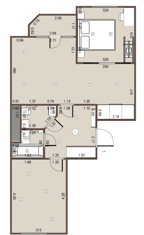 Мы с мужем хотим отдельную детскую для деток, спальню ( хотя бы маленькую) для себя и кухню-гостиную. Девочки помогите с планировкой, это вообще реально в такой квартире? Пока думаем перенести стенку 1 спальни и объединить кухню с коридором. Но как там все так разместить, чтобы и маленький коридорчик остался и кухня и диван с телеком??? :) вот пока так думаем:
