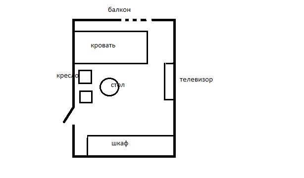 Открытая дверь это балкон, закрытая - входная в комнату. Не очень умею наводить красоту. Шторы вокруг кровати конечно не по двум карнизам, а один с - не знаю как сказать - плавным скругленным углом. Шкафы вот только сколько Вы хотели у меня не влезает. В углу у балкона - угловой шкаф широкий. При входе - узкий. А вообще если хотите смотреть телевизор и с гостинной зоны и с кровати, то делить точно нужно текстилем: захотел убрал, а перегородку никуда не уберешь и будет мешать смотреть