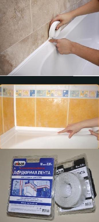 Я предложила ленту специальную, у нас внизу в хозяйственном продают, а муж против. Говорит что у нее клей (она самоклеющаяся) от воды портится, темнеет и размазывается, он такую уже клеил у себя дома...