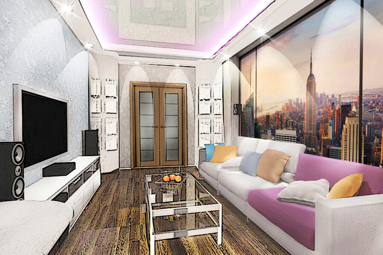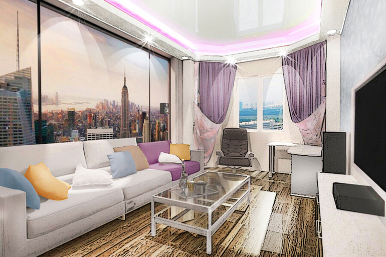Сразу поясню что я минималист в плане интерьера)Я бы убрала тяжелые занавески, потолок обычный сделала бы и эти 2 колонны по бокам двери.. Была бы возможность убрала бы тумбу из под ТВ, но там пусто получиться.. Да и нужно хоть элементарное хранение. А сам по себе дизайн притянул бы внимание.