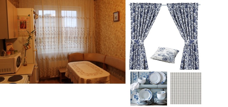 Я думаю,нужно, в первую очередь, снять всё с холодильника,снять скатерть со стола.Кстати,полочка с кактусами просто чудесная! Яркие,скорее всего однотонные,шторы,такие же салфетки на стол.А что с освещением? Как будто чего-то не хватает на потолке?