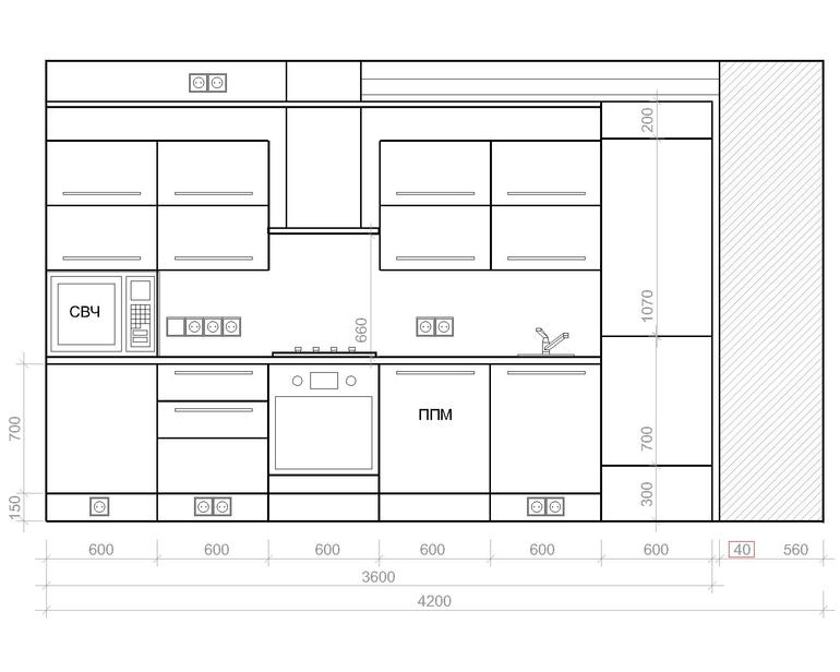 Размеры кухни 4,2м на 2,2м. Хоть длинна 4,2м, но спланировать мне нужно только 3,6м, т.к. будет у входа встроенный шкаф (там будут спрятаны хол., гор трубы и большая канализац-я труба). он будет около 60см. Сразу за ним холодильник и т.д.