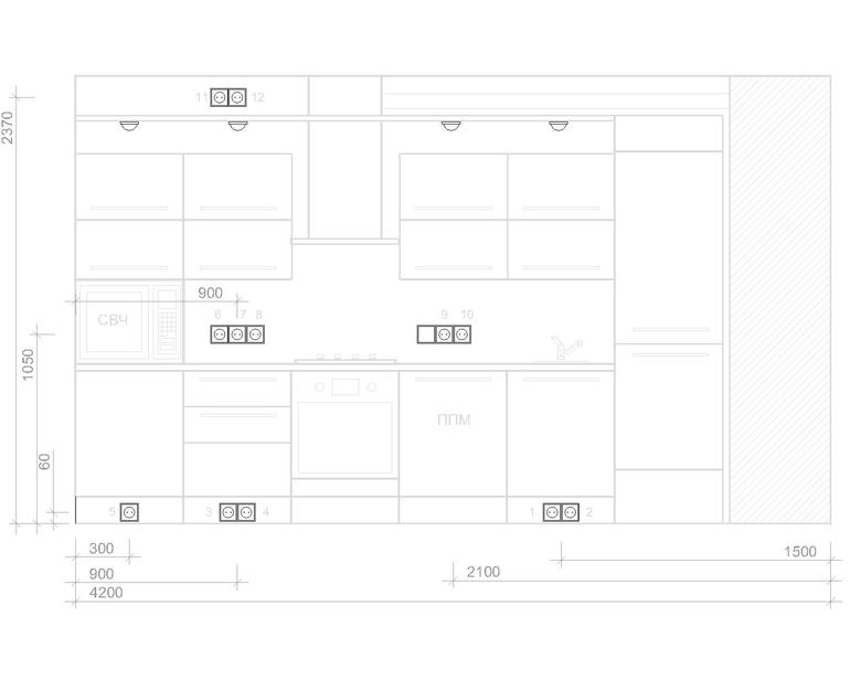 холодильник, 3 – варочная панель, 4- духовой шкаф, 5 – СВЧ, 6-10 розетки для рабочей поверхности, 11-подсветка,