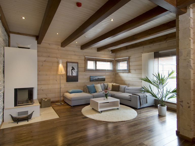 деревянные балки это оч круто. особенно если потолки высокие. кантри, шале, лофт и пр. стили интерьера, которые включают в себя потолочные балки. можно сам потолок делать темнее, а балки светлее - "дымчатый" потолок, можно белый потолок и балки в контраст. натуральная текстура дерева это богатство, особенно в своем доме. и обшивать вагонкой или гкл - кощунство. сейчас люди специально покупают балки из пластика под дерево или само дерево и искусственно надстраивают. это модно, это гармонично и уютно.