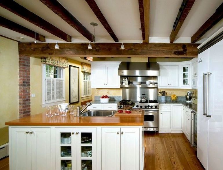 Балки, разумеется, красить в один тон с потолком и со стенами, тогда будет ощущение большого пространства.