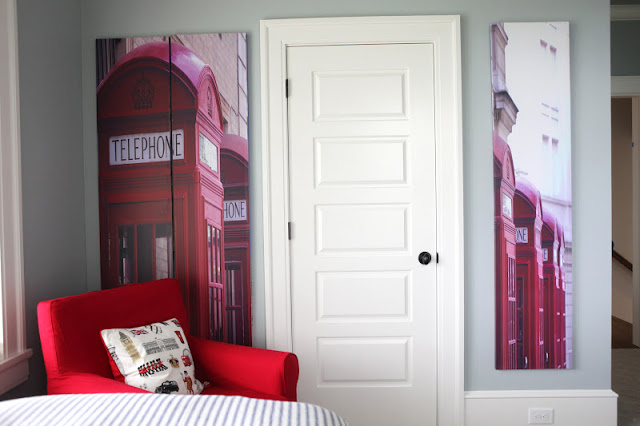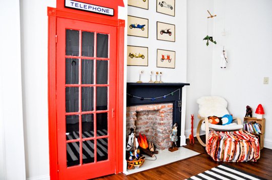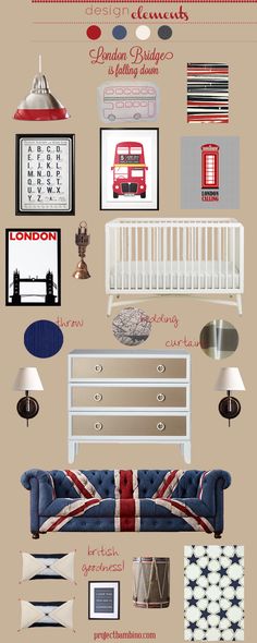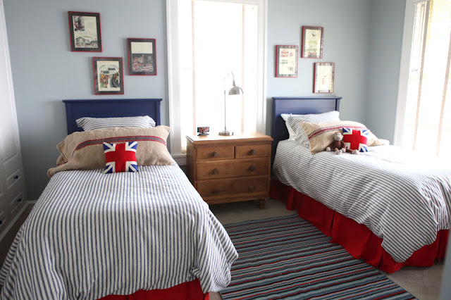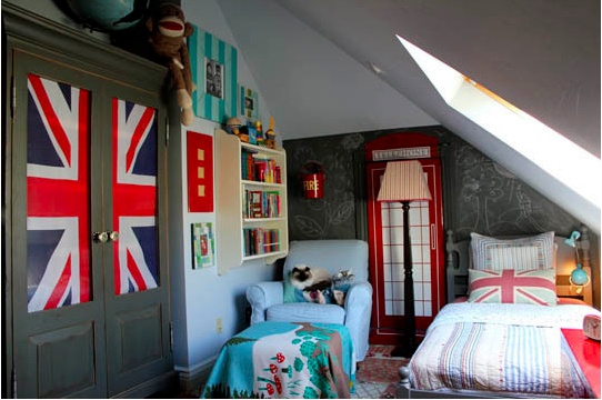 Я бы остановилась на бледно-голубом оттенке стен. Для мальчика это тоже подойдет. Добавила несколько постеров. Обязательно британский флаг в оформление, например, коврик. Красная телефонная будка мне тоже кажется вполне подходящей для детской.текстильобратите внимание как заправлены кровати.Такой текстиль(красный+полоска) есть в икее, например.