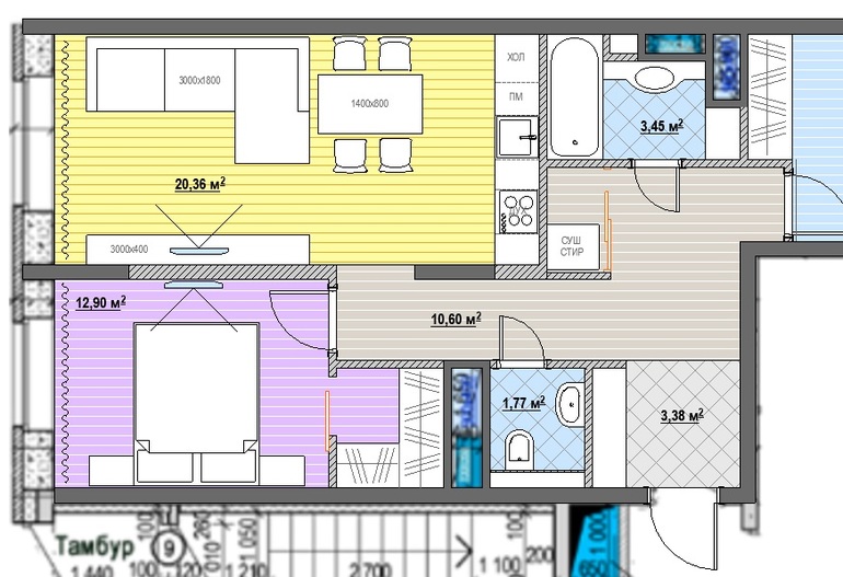 Мой второй вариант, тут боюсь, у вас из спальни выйдет совсем уж "кишка". Я же сама остановилась для себя на нем. Мне нравится в нем, что кухня становится очень просторной, и то что в спальне в получившихся 2-х аппендиксах у меня будут гардеробная и мини-кабинет