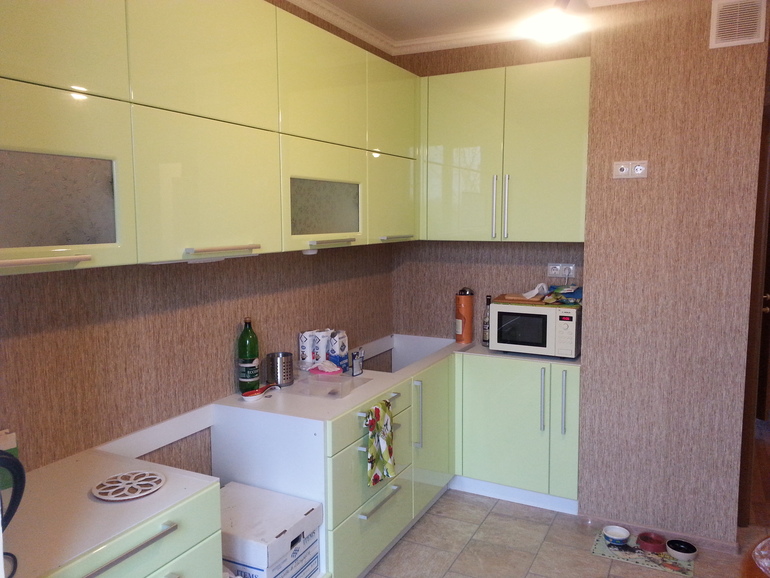 что-то никак не найду фото, на весь гарнитур, а не чястями... там у меня за холодильником еще пенал шириной 40 см.... мне все конструкторы-дизайнеры не советовали его делать, а без него надо делать хороший отступ от стены от шруб ( 25 см. где-то ) , что бы холодильник на 90 градусов открывался , поэтому я решила добавить еще см. и сделать пенал. еще шторы не подходят и у двери надо телек и еще что-то добавить.