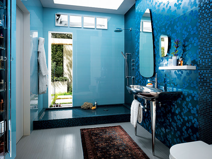 самое главное цвет синего и правильное освещение. Я бы не стала рисковать . Я склоняюсь к таким цветам + плитка не дорогая