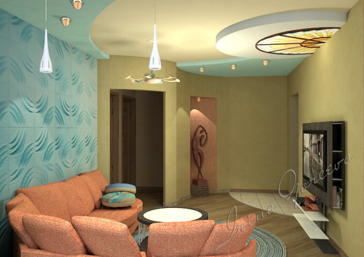 Интерьерное решение гостинойДевчата, выбрала обои в гостинную и что-то тормознула с их оплатой. Хочется необыного-смелого цветового решения, а получается как у всех - темный пол, светло бежевые обои и белый потолок с точечным очвещением. Хочу но боюсь)))