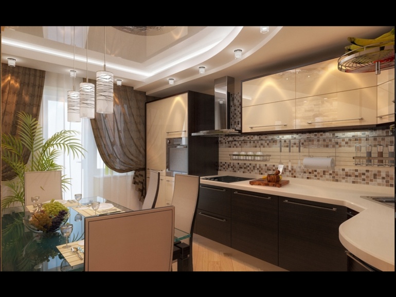 И у нас кухня 20м2,окно на солнечную сторону. Вопрос уже конечно решенный- будем делать коричневый глянцевый потолок, но с кухней пока не определились,еще кроме сочетания беж/венге, думаем оранжевый.