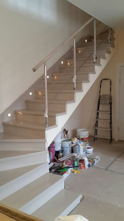 Лестница не моя,а у моих заказчиков. Ступеньки и перила-крашенное в несколько слоёв дерево, фурнитура хромированная.