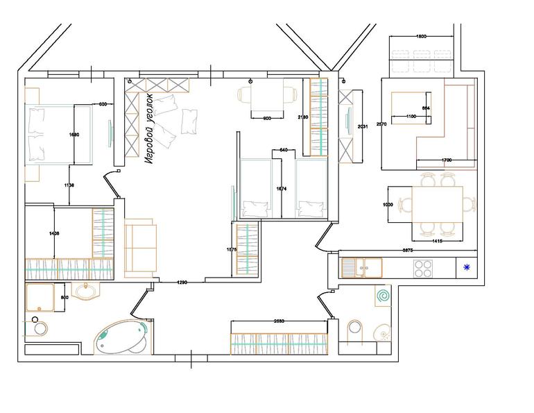 Мои задумки: увеличить ванную за счет коридора, перенести двери в спальню и детскую, в ванной будет кривая стена, иначе дверь не умещается, т.к. там идет монолитная колонна. Ванна получается узкая, всего 1,6*3,4м примерно, поэтому хочу угловой ванной немного оквадратить помещение. По спальне все понятно, кровать, гардеробная, комод напротив кровати. Далее по коридору прихожка+шкаф-купе, напротив туалет и небольшая постирочная со стиральной машиной. Дверь на кухню загородить и сделать вход из гостинной. В гостинной при входе шкаф-купе, далее стол рабочий, диван, напротив стенка с ТВ, у окна стол обеденный. На кухне гарнитур и небольшая барная стойка-стол для небольших перекусов.