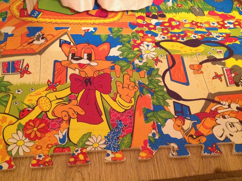 У нас таким ковром угол для игр застелен, но мне не нравится - уборку каждый день делаю, т.е. надо собрать этот коврик, вытрясти в ванную, потому что его просто не протрёшь и не подметёшь, под ним уже пол подметаю и затем тряпкой мою. Ребёнок там может что-то пролить или просыпать, и всё это в швах собирается. Он приятный на ощупь, но не функциональный вообще (( Вот, смотрите, я одну деталь от него в качестве коврика для мышки использую ))