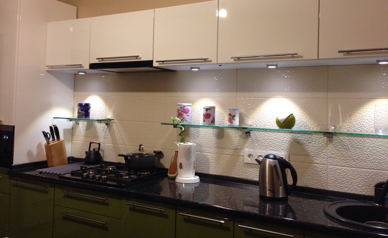 У нас стекляные полочки есть, мне нравится очень! Тоже не хотели шкафами утяжелять кухню.