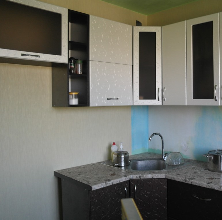 Ваша кухня так на нашу похожа (по расстановке)!!! Клеили обои под рогожку (как в предыдущем комментарии, только желтоватого а не бежево-песочного оттенка). Получилось вот примерно так (сорри за фото, это еще ремонт был в разгаре)