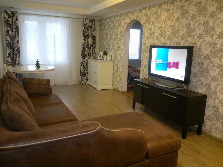 это я когда отрезала шторы из остатков скроила,так сказать хэнд мэйд,хотя белая скатерть для праздника есть, пока не могу привыкнуть к голому столу, он немного не так смотрится, не хватает простора.Стулья докуплю обязательно.Вот с раскрытыми шторами и без накидок на диван(просто диван был куплен в другой интерьер и там эти накидки обалденно смотрелись(стены молочно-бежевые ,пол венге),пока оставила от детей временно,потом или диван переселю или накидки сниму),хотя коричневый с серым очень даже не плох.