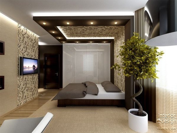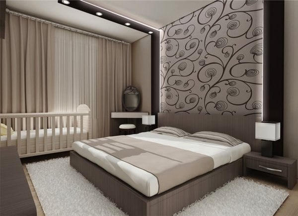 Интерьерное решение спальниспальня в 17 м2, разделена перегородками с обеих сторон. стена с права (обои с узором, а противоположная белая) не могу определиться со цветом штор (гардина и ночные шторы) может выбирать такие же оттенки, или наоборот сделать свежее, вообщем я очень запуталась. над кроватью планируется типа балдахин на конструкции из гипсокартона ( но буквально по пол метра с обеих сторон)