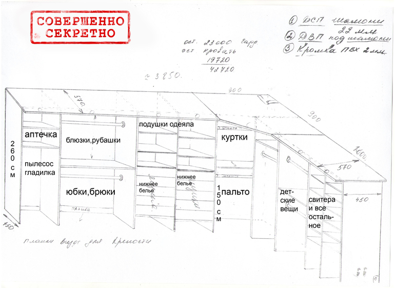 1. Смотря как вы в основном вещи храните. Я вот всю одежду храню на штанге. Меняю развеску по сезонам. Сезонные вещи храню в икеевских коробках на антресольных полках. 2. Разделить гардеробную (шкаф) на зоны. Зона мужа, ваша, детская. Тогда и вам легче будет в дальнейшем отслеживать свой гардероб.3. Обувь. Куда планируете ставить обувь?4. Глубина под плечики (там где штанги) нужна 600. При глубине 450 вешалки будут выпирать. А вот полки лучше 450, 600 глубоковато. Как сделала бы я:Основная стена (левое крыло):1 сек. Как у вас. Вверху аптечка/инструмент.2. Сек. Ваши штанги (верху - кофты, блузки, внизу - юбки, брюки). 3. Сек. Шианги мужа (верх рубашки, низ брюки). 4 сек. Штанги ребенка.При вашей высоте 260, у вас может еще антресольная полка над штангами влезть. Или внизу отделить для коробок с обувью.Все крыло глубиной 60 см (? Возможно ли?)Далее уголовная секция для хранения верхней одежды. Правое крыло:1сек вверху полки под постельное белье внизу выдвижные ящики под ниж. белье (ваше)2. Сек вверху полки под под постельное и домашний текстиль, внизу выдвижные ящики под нижнее белье муж. Обе секции не до пола, внизу 2 полки под обувь.И у вас еще останется 3я секция - под хранение остального, в том числе и обуви.Про кол-во выдвежных ящиков. Я бы сделала так: 6 и 6. Но, в муж секции разбила - 3 мужу 3 ребенку (нижние).Если чо, по таким принципам я планировала 2 гардеробных и 2 шкафа.