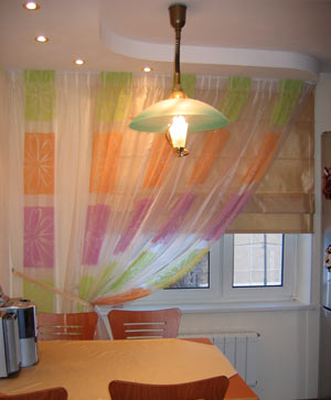Ясно.Вот и нам так продавец обьяснял когда на кухне заказывали.Только мы не нашли подходящий полностью прозрачный тюль..Сложность в том что во всех магазинах по пошиву риских штор нашего города шьют только из своей ткани..А в ателье наверное было бы дешевле, но страшно отдавать.Неизвестно что сошью..