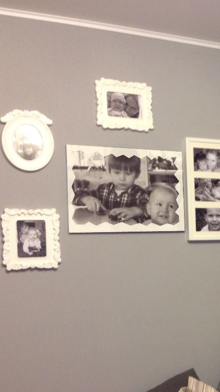 Не самое удачное фото для того, чтобы вешать на стену в рамке. Просто любой багет, даже самый тонкий еще больше обрежет изображение (сверху голову мальчика, снизу и справа фигуру малыша) Наверно лучше всего оставить без рамки. А остальные фото разместить чуть дальше от главного, чтобы воздуха больше было.Хорошо бы снять все фото и покрутить в разных комбинациях на полу, и наилучший вариант уже на стену расположить. Можете даже пофоткать и сюда выложить, девочки подскажут как лучше всего со стороны выглядит.