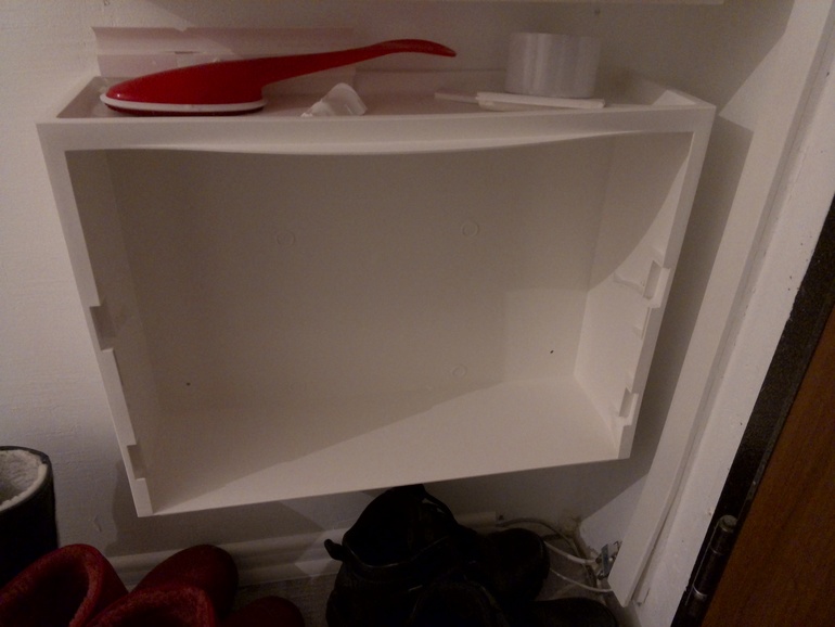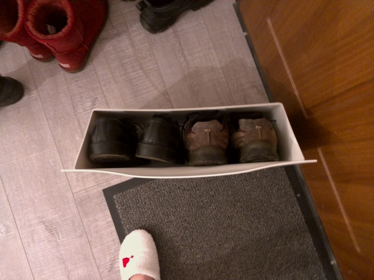 Она достаточно твердая, немного гнется. Не знаю, что надо сделать, чтобы не сломать. Песок высыпаться не будет, так как вставка для обуви литая. А вот как сохнуть будет, не знаю, так как дырок в ней для вентиляции нет. Вот фотки сделала. Две пары мужской обуви. Вытащила внутренний короб.
