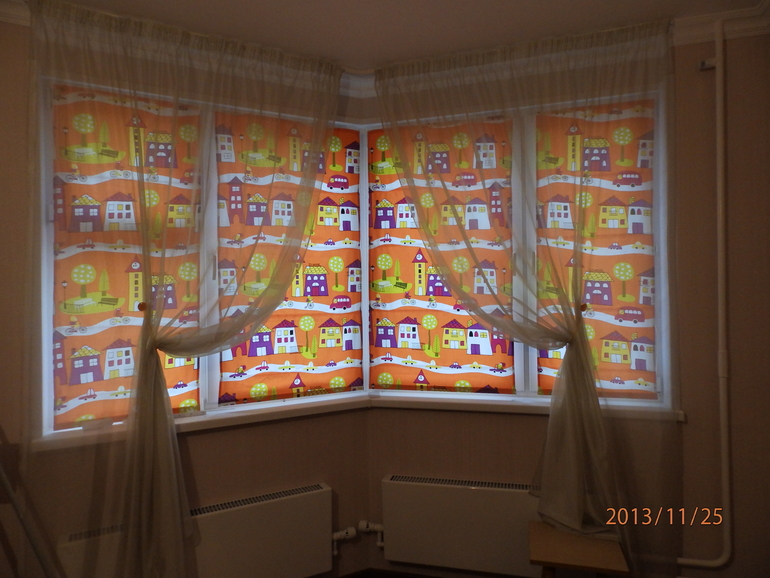 вариант 1 : цельный карниз , изгиб непосредственно по эркеру, тюль и декор штора. делали для девушки Светланы.    вариант 2. такой же карниз, тюль + римские шторы на оконные рамы, это детская для деток Вари.это , если быстренько из последнего)))