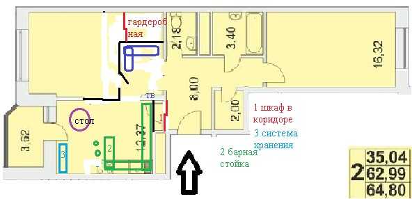у нас похожая планировка квартира 63м и то же дом все не сдан... только справа помещения в виде 2кв.м. у нас нет, коридор 10 метров. Будем двигать стенку между кухней и спальней до окна. Будет студия и 2 спальни