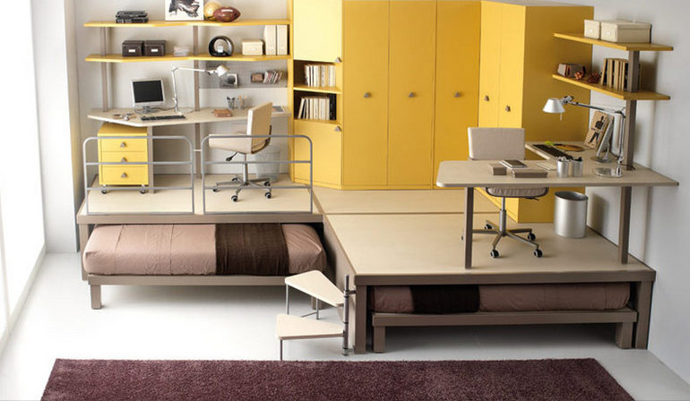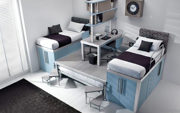 Интерьерное решение детской комнатыПожалуйста, подскажите, что можно сделать в маленькой комнате, чтобы там можно было жить маме и двум деткам(9 и 1,6 лет).!!! Хочется использовать каждый см , но не соображу как...Какая должна быть мебель, чтобы вместить и рабочую зону и спальные места