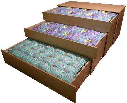 Вам небольшой раскладной диванчик, детям двухярусную кровать. Игрушки можно хранить под детской кроватью. Письменный стол не грамоский, должно все поместится.