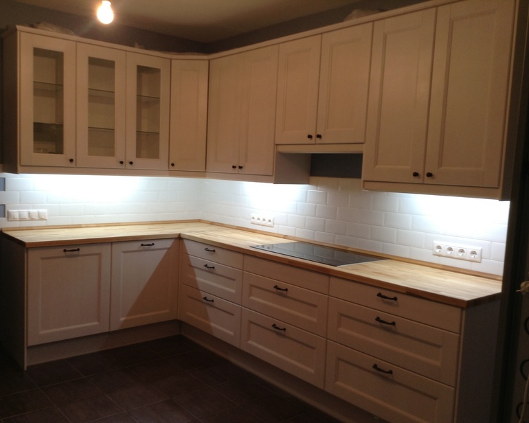 Светлана, сначала увидела только первое предложение, поэтому ответ не полный :-)Мусорное ведро под раковиной, то есть за второй дверцей шириной 60 см.Это икеа, фасад рамше белый. Вся мебель обошлась примерно в 200к. Это цена только за мебель. Точно не скажу, так как покупали в два этапа, что-то докупали, что-то сдавали потом. На фото не видно еще 2 колонны, ящик на холодильником и небольшой "комод" в обеденной зоне. Комод - это два подвесных ящика на ножках под столешницей.У Икеи неплохой онлайн планировщик, там же можно увидеть цену той мебели, которую Вы выбрали. Производителя мы выбирали долго. А выбрали икею, потому что можно все купить сразу, можно менять и докупать. Также порадовали 25 лет гарантии :-)