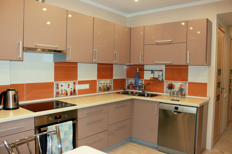 у нас тоже почти такое же расположение, вот нашли недостаток - при открывании дверки под мойкой ( где у нас мусорка) дверка ручкой бьется в соседнюю дверку.Для сохранения внешнего вида надо наверное на эту дверь ставить какой-то механизм плавного открытия ( что бы не стукались). если существуют такие.Мы стараемся аккуратно открывать, но все равно кто-то стукнет, то в гости дети придут - махнут