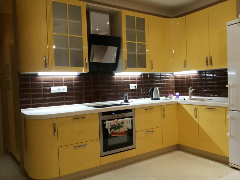 Раковина конечно сдвинута ближе к холодильнику...поставить его к окну не получится,очень он у нас большой...а менять его не хочу...моя мечта конечно вдоль окна сделать рабочую зону,но глубина откосов всего 12см и высота окна не позволяет этого сделать...Дверцы пенала будут стеклянными но крашеными в тон гарнитура..внутри планирую сделать подсветку чтобы он как то светился в углу и не смотрелся культяпкой..Кстати можно посоветоваться насчет цвета?..Хочу светлые фасады +темную столешницу..Как?