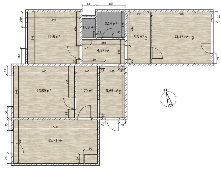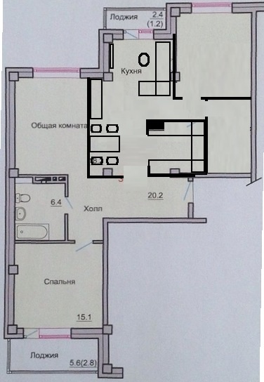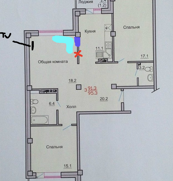 По планировке не видно как у вас проходят коммуникации. Но судя по рисунку, у вас как раз посередине идет стояк. И теоретически есть возможность размещать кухню в любом направлении от стояка. Но так как мы можем размещать только над кухней или нежилой зоной, то все соблюли.В кухне гарнитур получился поделен на 2 части за счет того, что есть скошенная стена.Как вариант: вход в кухню может быть на месте скошенной стены.Но я, как хозяйка, не хотела бы, чтобы ходили через кухню, особенно, когда я готовлю. Чтобы не бегали дети, мешаясь под ногами.В коридоре я нарисовала шкаф по его длине, но сама не люблю громоздкие шкафы, предпочитаю гардеробные ;-). Если еще возникнут мысли, то порисую ;-).