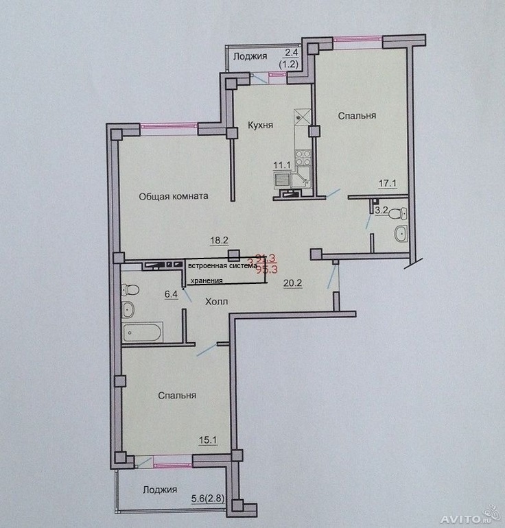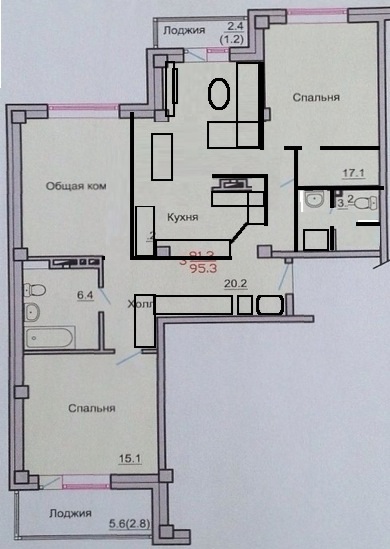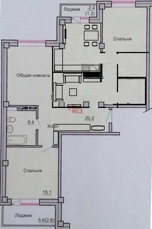 красным рядом с туалетом кухня. Но тут я не знаю куда поставить стол и стулья и боюсь диван не войдет.