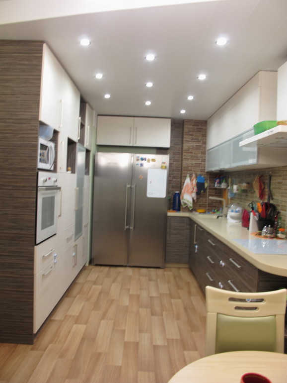 По левой стене и по верхней будет идти кухонный гарнитур. От него (по верхней стене) стоять холодильник сайд-бай-сайб.