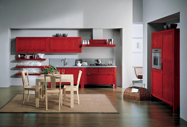 Еще как вариант пересмотреть материал фасадов. Глянец действительно может со временем начать напрягать. Оттенок красного так же имеет значение!