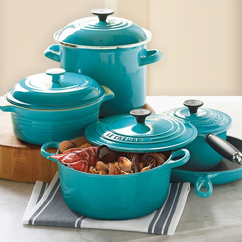 Маленькая красная чугунная кастрюлька с некой бутылкой (вазой) и форма для выпечки... Бирюзового цвета:)