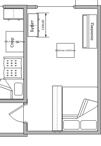 Про ДСП и подиум согласна. Про вес - в целом тоже, но буду пытаться найти конкретику - насколько это тяжело в эксплуатации и недолговечно (на 25 лет нам в общем-то и не надо, наверное...). План прилагаю, хотя мне и неловко вас настолько от дел отрывать. Габариты: 3300 на 5550. Буфет и пианино будут точно. Сейчас как раз и нарисован вариант с отделением кровати шкафчиком, но для гостей хотелось бы поставить еще диван + возможно, хотя бы журнальный столик. И при этом не заставить всю комнату мебелью, а оставить пространство и не протискиваться бочком в комнату. Окно с балконом, его мебелью перекрывать тоже нельзя.