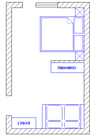 тк комната имеет ширину 330 см, а кровать 200, то остается вполне комфортный проход в 130 см, его хватить на открывание балконной двери. Зонирование предлагаю сделать из фальш-стены толщиной 10 см и длиной чуть больше пианино, вместо дивана я б порекомендовала два кресла, но тут уже исходите из количества гостей, которых нужно разместить на ночь