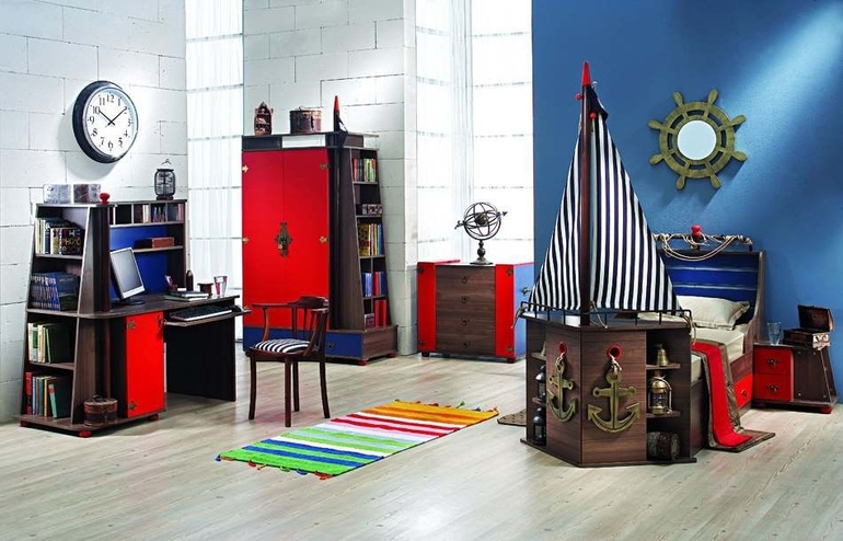 А вы прям в морском стиле комнату хотите? Я тут у одной девочки видела детскую-очень красивая,кровать не корабль,но у неё там остальное оформление на морскую тематику.Если найду-кину вам ссылку.