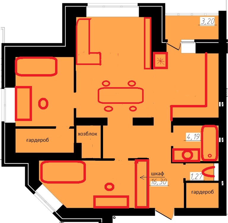 к сажалению не знаю я , дом еще строится, нам только такой план квартиры дали.....